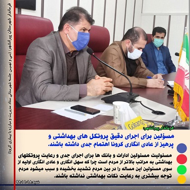 ▪️فرماندار شهرستان پیرانشهر در سی و نهمیـن جلسه شهرستانی ستاد مدیریت و مبارزه با بیماری کرونا ضمن قدردانی از همه کسانی که برای اجرای مصوبات ستاد ملی کرونا و اعمال محدودیتها تلاش کردند، گفت: مسئولیت مسئولین ادارات و بانک ها برای اجرای جدی و رعایت پروتکلهای بهداشتی به مراتب بالاتر از مردم است؛ چرا که سهل انگاری و عادی انگاری اولیه از سوی مسئولین این مساله را در بین مردم تشدید بخشیده و سبب میشود مردم توجه بیشتری به رعایت نکات بهداشتی نداشته باشند.