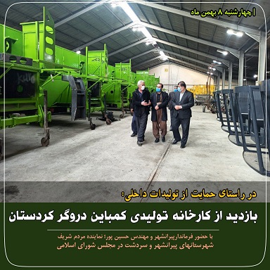 در راستای حمایت از تولیدات داخلی: ▪️بازدید از کارخانه تولیدی کمباین دروگر کردستان . 🔺با حضور فرماندار شهرستان پیرانشهر، مهندس حسین پور؛ نماینده مردم شریف شهرستانهای پیرانشهر و سردشت در مجلس شورای اسلامی