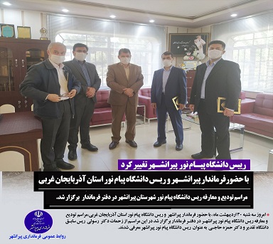 ▫️ به گزارش روابط عمومی فرمانداری شهرستان پیرانشهر امروز طی مراسمی با حضور فرماندار شهرستان پیرانشهر و رئیس دانشگاه پیام نور استان آذربایجان غربی، مراسم تودیع و معارفه رئیس دانشگاه پیام نور شهرستان پیرانشهر در دفتر فرمانداری برگزار شد.