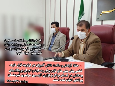 فرماندار پیرانشهر در سومین جلسه هماهنگی و برنامه ریزی برگزاری آزمون سراسری در شهرستان پیـرانشهر: حفظ آرامش و سلامت دانش آموزان در اولویت قرار دارد / تمامی پیش بینی های لازم برای رعایت و اجرای پروتکلهای بهداشتی در تمام مراکز برگزاری آزمون سراسری در شهرستان پیرانشهر انجام شده است.