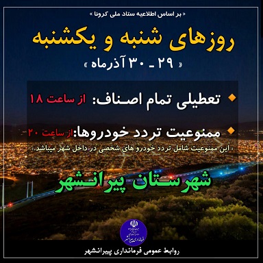 به استحضار عموم شهروندان میرساند با توجه به مصوبات ستاد ملی و استانی مدیریت بیماری کرونا روزهای شنبه و یکشنبه مورخه ۲۹ لغایت ۳۰ آذر ماه: