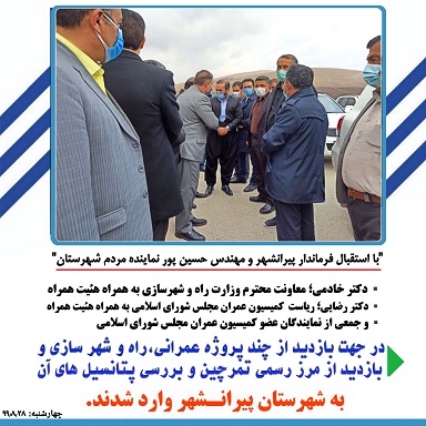 ▪️دکتر خادمی؛ معاونت محترم وزارت راه و شهرسازی به همراه هئیت همراه: ▪️دکتر رضایی؛ ریاست محترم کمیسیون عمران مجلس شورای اسلامی به همراه هئیت همراه: ▪️و جمعی از نمایندگان عضو کمیسیون عمران مجلس شورای اسلامی _جهت بازدید از چند پروژه عمرانی، راه و شهرسازی و بازدید از مرز رسمی تمرچین و بررسی پتانسیل های آن به #شهرستـان_پیرانـشهر وارد شدند.