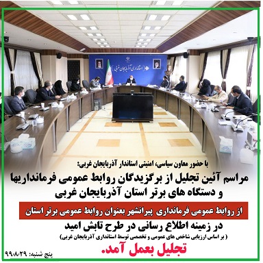 🔺 در این مراسم از روابط عمومی فرمانداری شهرستان پیرانشهر بعنوان یکی از #روابط_عمومی_های_برتر_استان در زمینه اطلاع رسانی در طرح تابش امید( بر اساس ارزیابی شاخص های عمومی و تخصصی توسط استانداری آذربایجان غربی) تقدیر و تجلیل بعمل آمد.