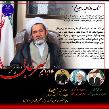 ⚫️| حاج ماموستا محمودی؛ امام جمعه پیرانشهر، مهندس حسین پور؛ نماینده مردم شریف شهرستان های پیرانشهر - سردشت در مجلس شورای اسلامی، سید علی ترابی؛ فرماندار شهرستان پیرانشهر در پیامی مشترک درگذشت " حاج ماموستا ابراهیم سرخابی " نماینده ولی فقیه در امور اهل سنت شهرستان پیرانشهر را تسلیت گفتند.