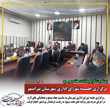 ✍به گزارش روابط عمومی فرمانداری پیرانشهر، امروز سه شنبه ۲۷ آبان ماه سال جاری، جلسه شورای اداری شهرستان به مناسبت هفته بسیج و هماهنگی های لازم در اجرای هرچه بهتر برنامه های هفته بسیج، به ریاست فرماندار شهرستان پیرانشهر، معاون هماهنگی سپاه، بخشداران مرکزی و لاجان و سایر مسئولین ادارات شهرستان در محل سالن اجتماعات فرمانداری برگزار گردید.