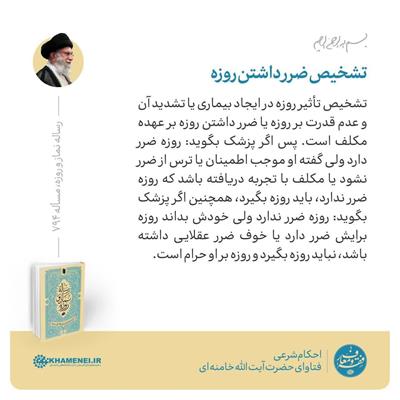 ✅ تشخیص تأثیر روزه در ایجاد بیماری یا تشدید آن و عدم قدرت بر روزه یا ضرر داشتن روزه بر عهده مکلف است. پس اگر پزشک بگوید: روزه ضرر دارد ولی گفته او موجب اطمینان یا ترس از ضرر نشود یا مکلف با تجربه دریافته باشد که روزه ضرر ندارد- جمعه 19 فروردین 1401 ساعت 08:30