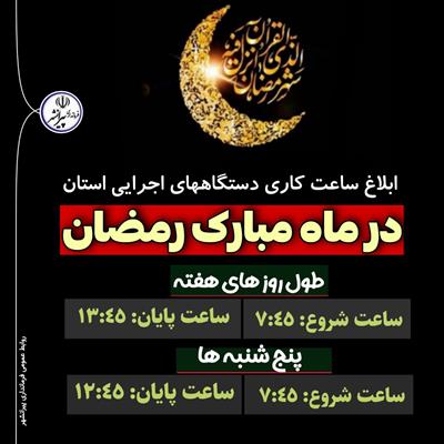 ⭕️ برای استفاده بهتر از فرصت عبادت و فضایل این ماه ، ساعت کاری دستگاههای اجرائی در #ماه_رمضان یک ساعت زودتر خاتمه خواهد یافت . (ساعت شروع ٧:٤٥ و ساعت پایان ١٣:٤٥ )