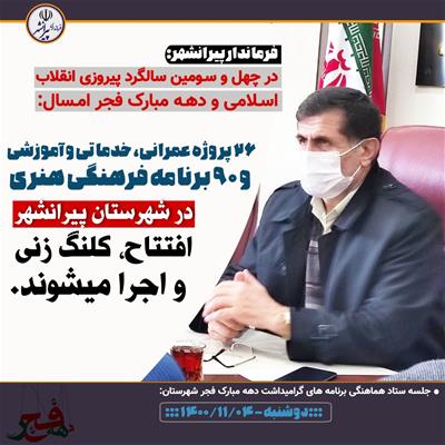 🔴 در چهل و سومین سالگرد پیروزی انقلاب اسلامی و دهه مبارک فجر امسال؛ 26 پروژه عمرانی، خدماتی و آموزشی و 90 برنامه فرهنگی هنری در شهرستان پیرانشهر افتتاح، کلنگ زنی و اجرا می شوند.
