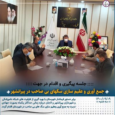 🔸برابر دستور فرماندار شهرستان با بهره گیری از امکانات و ظرفیت های شبکه دامپزشکی و شهرداران پیرانشهر و لاجان در بازه زمانی مشخص و حداکثر یکماه با عزم راسخ و جهادی نسبت به جمع آوری وعقیم سازی سگ های بی صاحب در سطح شهرستان اقدام و گزارش عملکرد آن بصورت مستمر به فرمانداری منعکس گردد.