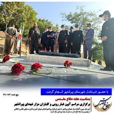 در چهارمین روز از هفته دفاع مقدس، آیین غبار روبی و گلباران مزار شهدای پیرانشهر با حضور فرماندار پیرانشهر، مسئولین نظامی و انتظـامی، اعضای شورای تامین و اداری شهرستان در محل گلزار شهدای پیرانشهر برگزار گردید.