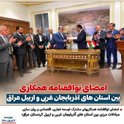 ⭕️ امضای توافقنامه همکاریهای مشترک توسعه تجاری، اقتصادی و روانسازی مبادلات مرزی بین استان های آذربایجان غربی و اربیل عراق؛