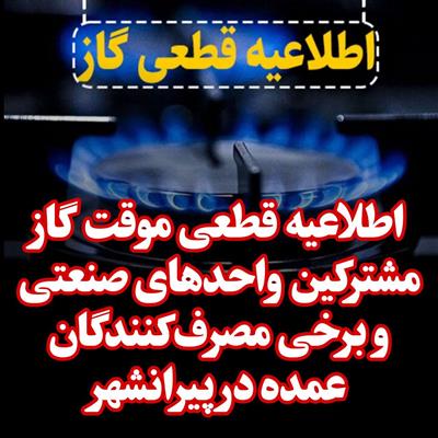 🔴 اطلاعیه قطعی موقت گاز مشترکین واحدهای صنعتی و برخی مصرفکنندگان عمده در پیرانشهر
